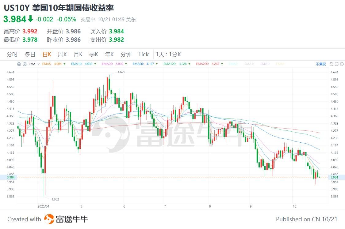格隆汇10月21日|摩根士丹利策略师表示,10年期美国国债收益率跌破4.0%后,有进一步下跌的空间。该行的美国利率策略团队对美国国债仍持乐观态度,称美国政府持续停摆和贸易紧张局势升级是有利因素。